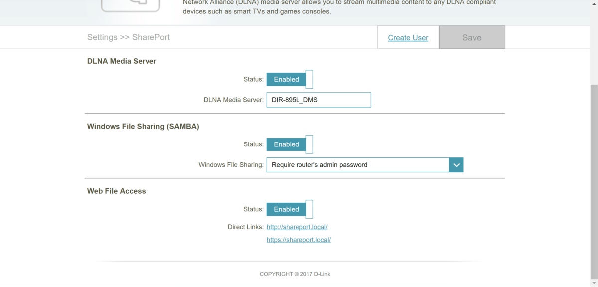 The D-Link DIR-895L performs well with storage plugged into its USB port, I typically got around 50MB/s reads and 30MB/s writes with an external hard drive plugged into the USB3.0 port. So, this should work perfectly fine for a very simple NAS for functions such as backups.The wired network works just as well as you would expect any gigabit network to work. When transferring files from my PC to server I achieved speeds of around 120MB/s in both read and write. This is close to the peak performance of the drives themselves and it is about the maximum speed you are going to get from a wired gigabit network.Overall