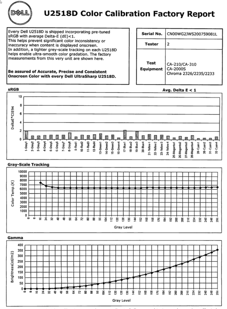 The monitor comes with multiple presents including ‘Standard’, ‘ComfortView’, ‘Movie’, ‘Game’, ‘Colour Temp.’ and ‘Custom Colour’. Out of the box it uses standard, and as usual, the default brightness is set to very high, I think I might just be overly sensitive to brightness as literally every monitor is like this for me. Once you tone down the brightness it provides quite a pleasant picture. Colour accuracy appears to be quite good as far as my subjective and amateur eyes can tell. It performs better than my 2 personal monitors, a 40” Samsung 4K screen and a 27” 4K Viewsonic.In fact, Dell has taken the calibration quite seriously and included a factory calibration report in the packaging which is specific to each individual report. I don’t have any way to test if this is accurate, but it is certainly impressive.