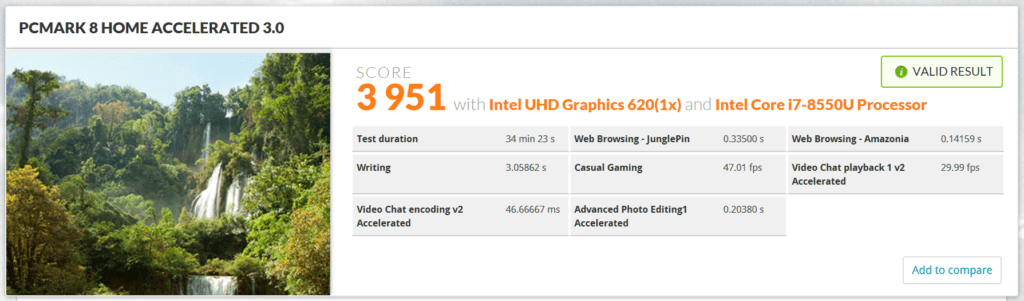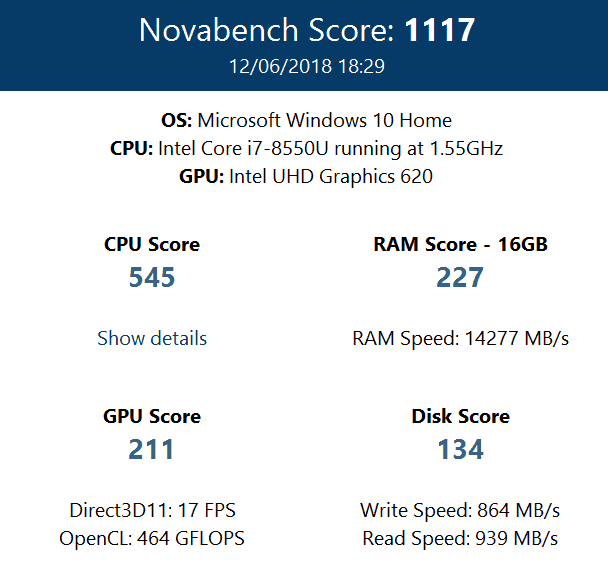 With this using the latest generation Intel mobile chip combined with a Toshiba NVMe solid state drive, day to day performance is wonderful. The laptop flies through my daily tasks and can handle all media I throw at it.Interestingly this still uses LPDDR3 for the RAM compared to the faster DDR4 found on the XPS 15. I doubt anyone would notice the real-world performance difference though. I daren’t open up such an expensive laptop, but I believe the RAM is soldered on, so when you buy it make sure you think about the amount you need.The Kaby Lake R quad-core Intel Core i7-8550U doesn’t need benchmarking tests, it is well documented and will offer similar performance as every other laptop that uses this CPU. For the sake of completeness, I did run a couple of quick tests to make sure there was nothing glaringly wrong with the set-up with the results shown below.