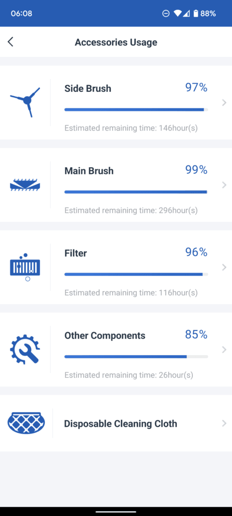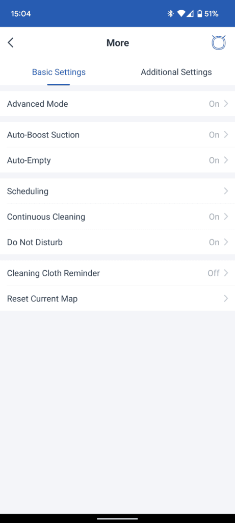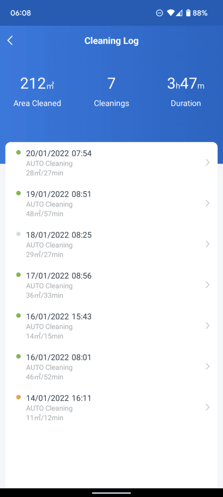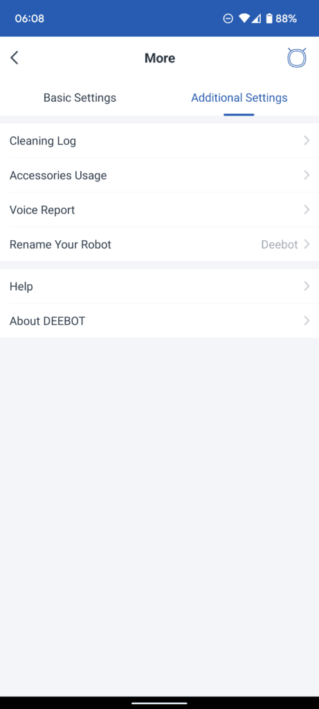 Under additional settings, you can see a log of previous cleans. I need to remember to leave my doors open in the morning, and the logs are handy to see if the Deebot has covered the whole house or not.