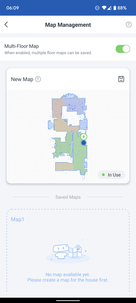 Deebot will save a map when it completes a cleaning cycle and return to the charging dock automatically. The Deebot won’t save the map if you control it to charge itself or you move it manually to another area to clean when it is in its first cleaning.