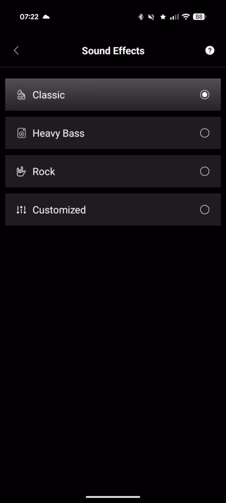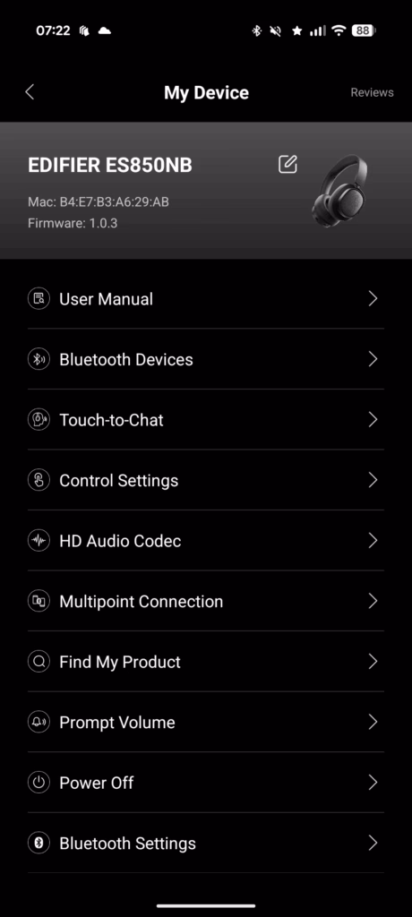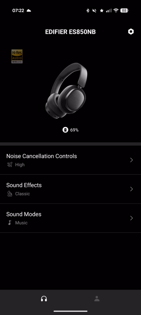 The Edifier ConneX app provides access to the headphones’ various features and customisation options. When you open the app, you have quick access to the main functions you will likely want, noise cancellation, sound effects and sound mode.