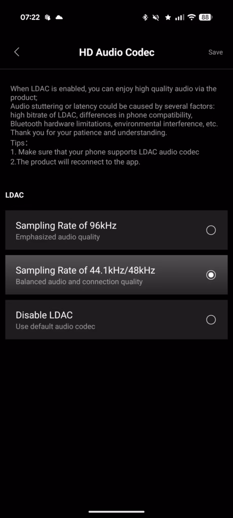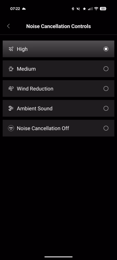 The app gives you four ANC levels to choose from: off, low, medium, and high. In practice, I found little reason to use anything other than the high setting. The difference between the levels is noticeable, but if you’re going to use ANC at all, you might as well use it at maximum effectiveness. The app allows you to customise which modes are available when you cycle through them using the physical controls, which is a nice touch if you want to simplify the options.