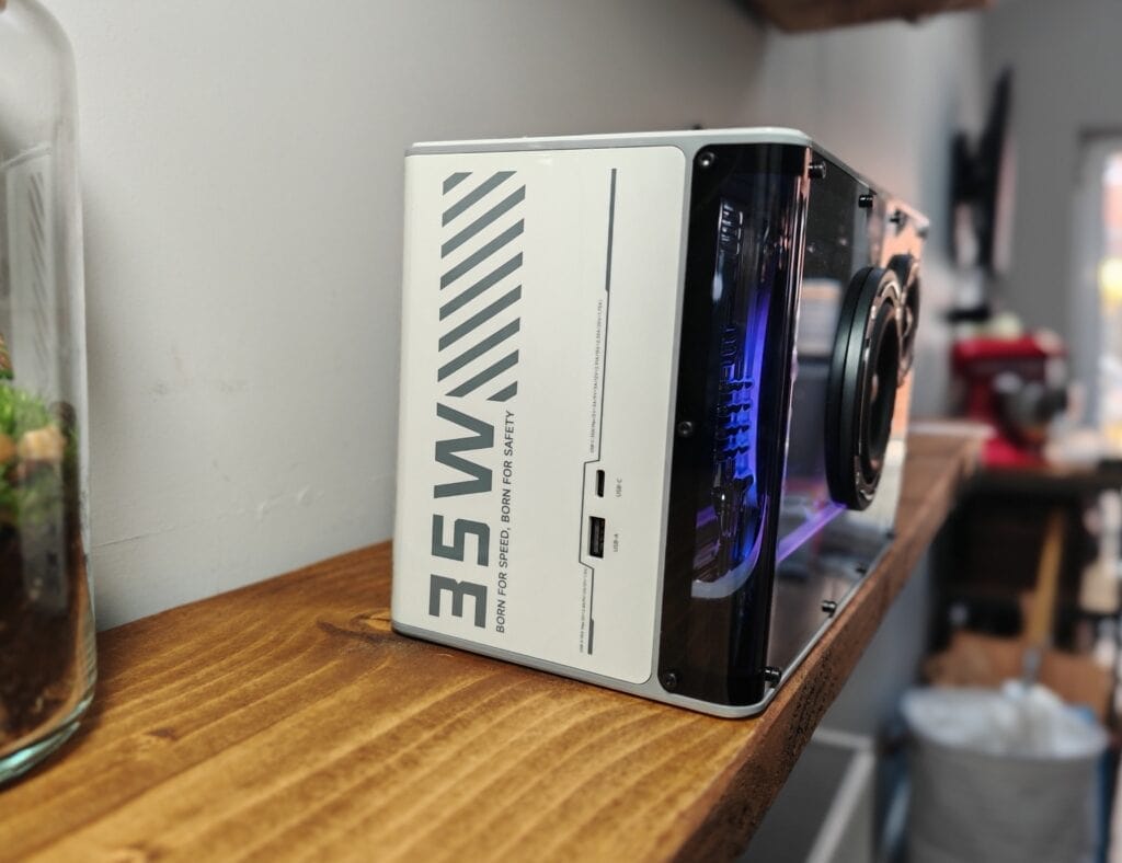 One handy feature is that on the side of the speaker are two additional USB ports, one USB-A and the other USB-C. This is actually a GAN charger that supports up to 35W power delivery with the USB-C port or 18W with the USB-A. You can never have too many USB-C chargers lying around.