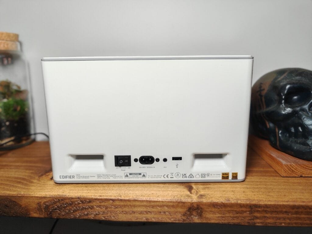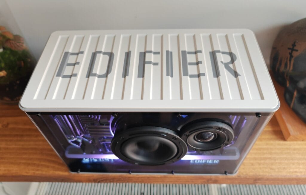 The other sides of the speaker are a bit less noteworthy, all being white plastic. The top of the speaker has a large Edifier logo, and it is perhaps a little excessive with the branding.