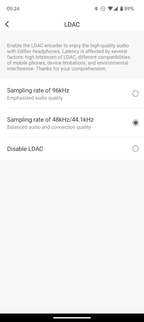I can’t say I noticed a huge improvement by having LDAC enabled or increasing the sampling rate to 96kHz. You have to repair the headphones when you change the setting, so it is not very easy to quickly change and see how much difference there is. While I like LDAC and always use it when available, I rarely notice that much difference in general, but this will depend on the source material as well.