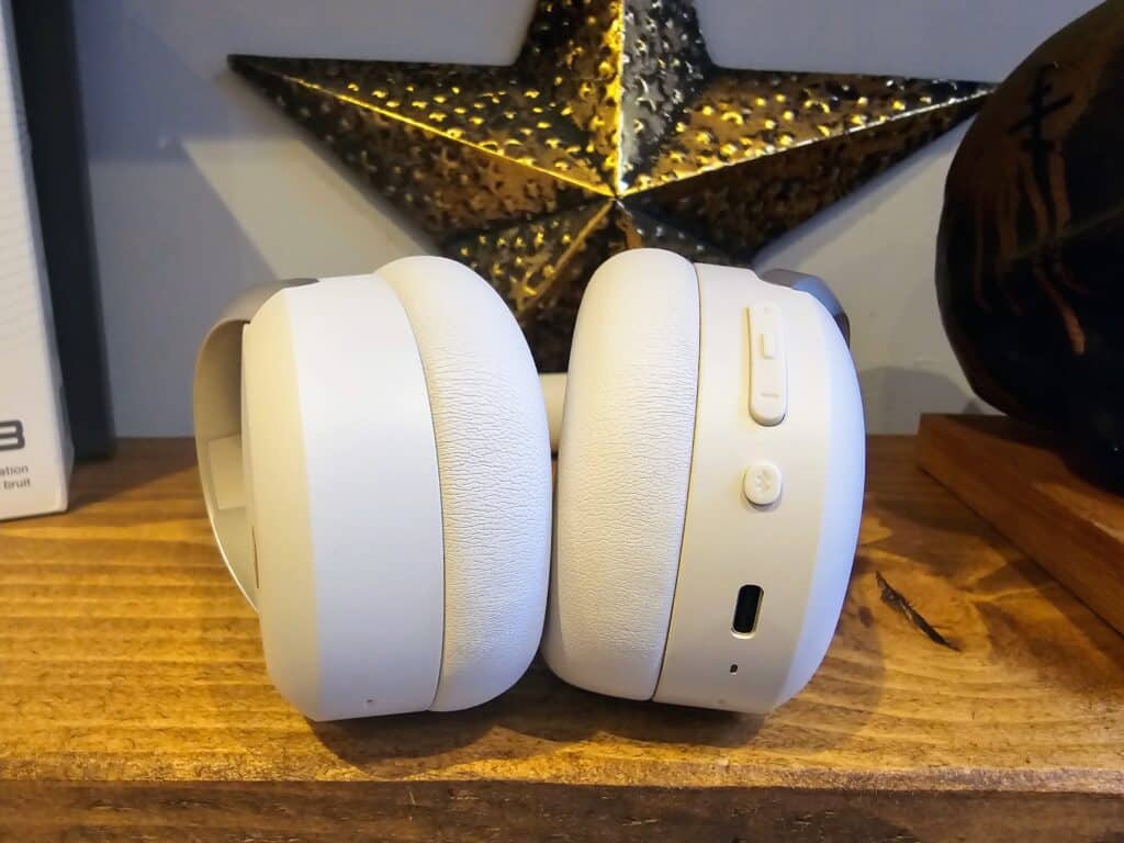 Physical controls are located on the right ear cup, including buttons for power/pairing, volume up/down, and a multi-function button for play/pause and call management. The right ear cup houses the ANC button, volume and power buttons as well as the USB-C port.
