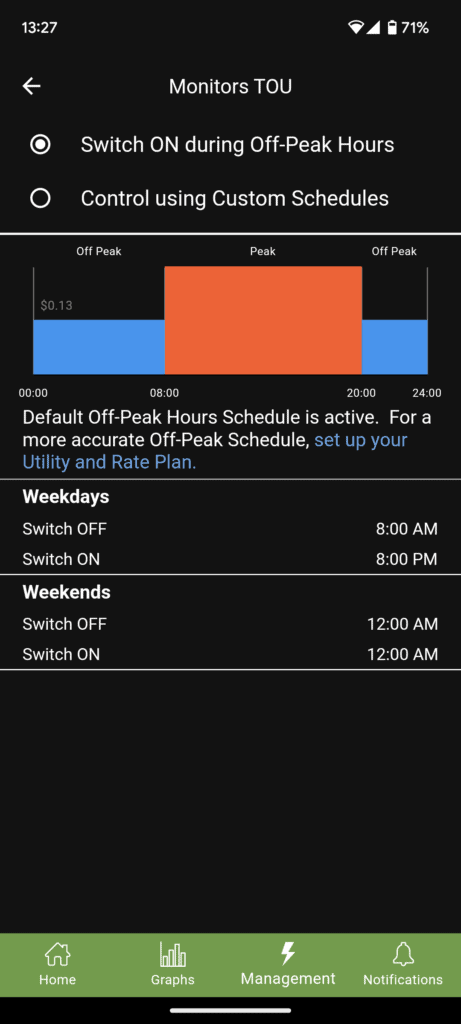 The off-peak hours use default times, but there is an option to set it up using utility rates. The rate based on location option uses data from OpenEI, which is a US-orientated service. Therefore there is only limited use if you want to use the off-peak hours setting in the UK. You can achieve the same functionality by manually setting up your schedules.