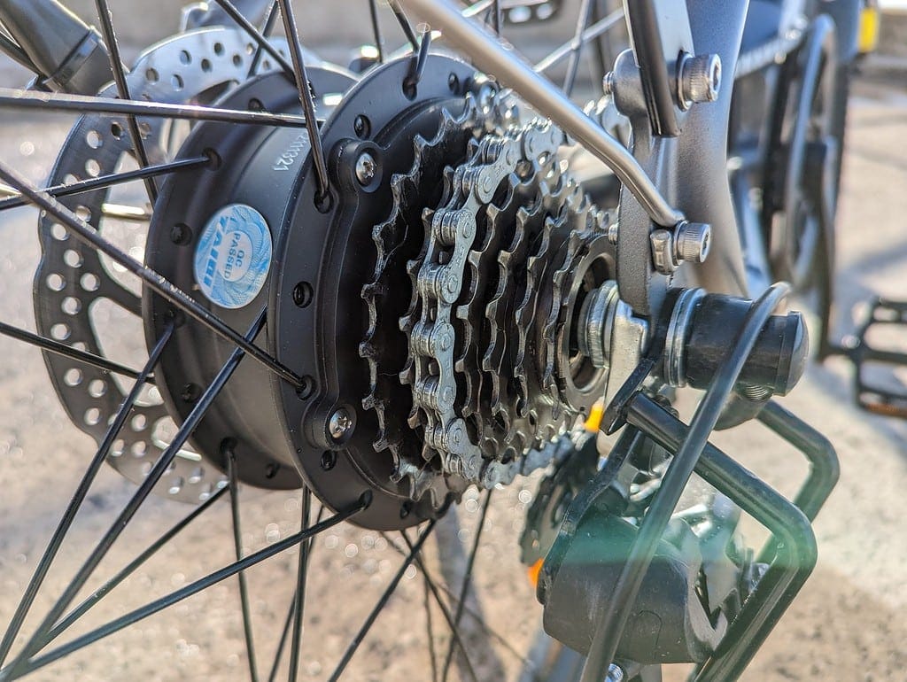 The Shimano Tourney 7-speed gear system is probably the most common gear system for these affordable Chinese E-bikes. Like all other bikes that use this, it works OK, providing basic gearing, but the 9-speed Shimano Altus on the ADO D30C was far superior if you want to be able to provide more peddle power.