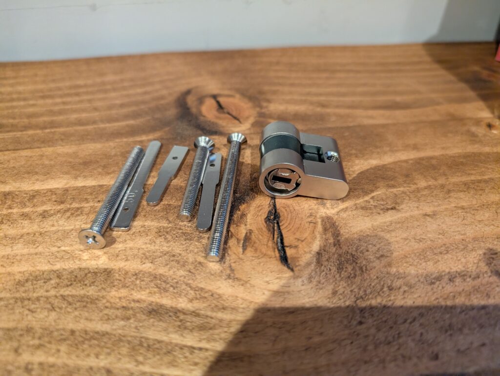 What I didn’t realise was that this could be adjusted by height, and you could even remove the threaded screw pillar, which allowed me to install the lock without drilling my door.