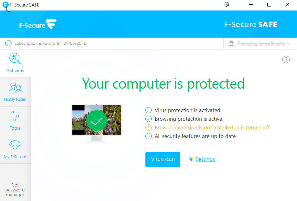 For me, this is the main feature I was interested in. I have not had a virus in years, and there seems to be a growing opinion that anti-virus software is not worth it. Cutting edge malware can bypass it, and as long as you apply some logic to what you do on the Internet then there should be no reason to get a virus. I spend 8+ hours a day on my main PC and it is quite powerful, so I am not overly concerned about any performance issues, and I like the added layer of security. When Windows 7 came out Windows Defender was classed as the best performing application but in recent years it seems to have slipped. The past few years I have switched between whatever premium application is cheap or I can blag a free licence. Kaspersky has generally been my preferred choice, and in the last year I have used Bitdefender, which I have found quite annoying to use, so I was glad to switch to F-Secure.F-Secure actually require you to sign up to their website and input your product key there, this is a bit unusual and I am sure some people won’t like it. It is essential to the family control features, and I personally didn’t find it too much of an issue.Once downloaded, installing the app was easy. As part of the install process, it tries to install a browser extension. I always reject these, I need quite a few extensions for my work, and Chrome is already a memory hog so I keep my extensions to the absolute minimum. Also, I already use an adblocker and Disconnect which blocks tracking and some JavaScript. Being mindful of what you are browsing and downloading should be adequate for anyone tech savvy, but for less experienced users I am sure the extension is great.The UI of the app is quite straightforward too, in comparison I found navigating the features of Bitdefender a nightmare. Within the Antivirus there are several features including: