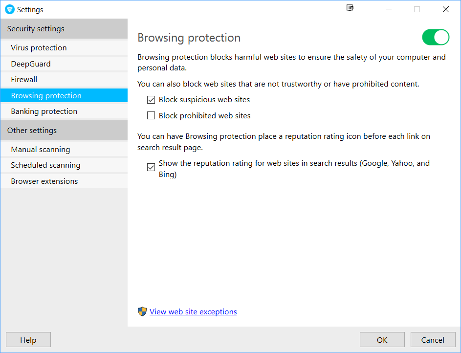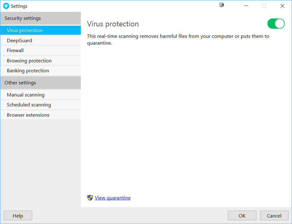 This is the main option I need, you can optionally switch off real-time protection but I wouldn’t recommend it. One of the issues I have had with security applications in the past is the aggressive detection and making it challenging to whitelist files. As I work in development sometimes files I download can cause false alerts and I need to be able to whitelist them so I can at least see what is going on with it. It is reasonably easy to do this with F-Secure.