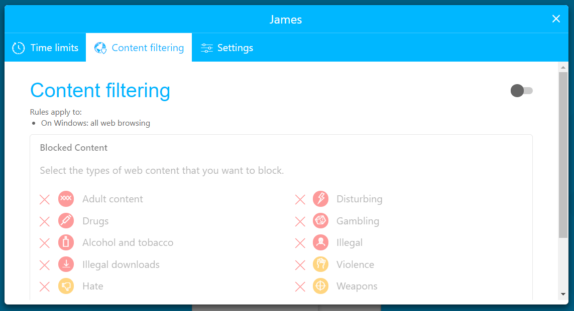 Within the content settings, you can block the usual things you would expect such as adult content, gambling, drugs and illegal downloads. You can also prevent things like shopping and auction websites or go as far as blocking social networks.
