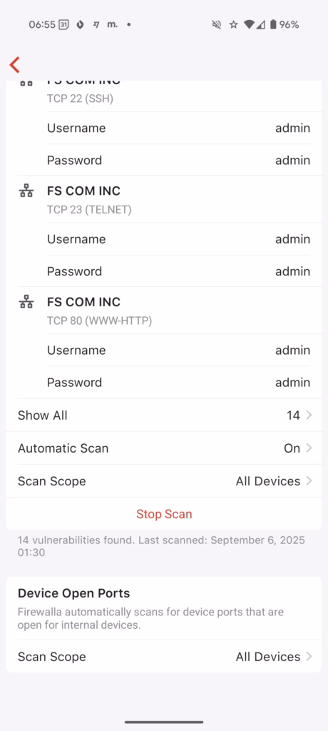 Vulnerability scanning is basic compared to enterprise solutions but adequate for home and small business use. It identifies common security issues like default passwords, open services, and outdated firmware.