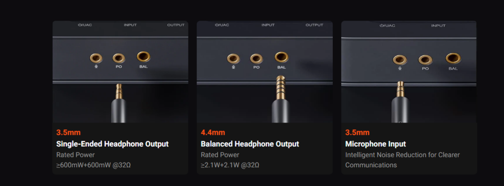 - Balanced and Single-Ended Outputs: The device features a 4.4mm balanced headphone output with a rated power of ≥2.1W+2.1W @32Ω, and a 3.5mm single-ended headphone output with a rated power of ≥600mW+600mW @32Ω, accommodating a wide range of headphones.