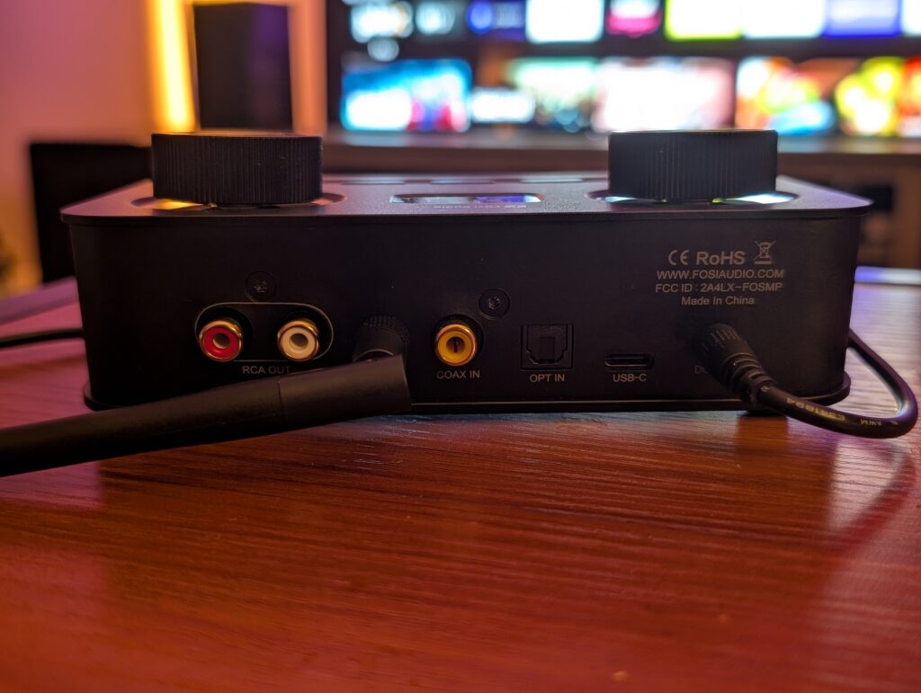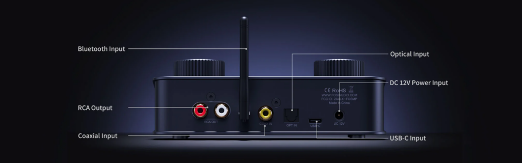 On the front are the headphone outputs and microphone input, and on the rear are the power input, USB-C/optical/Coaxial input, an antenna for Bluetooth input, then the RCA output.
