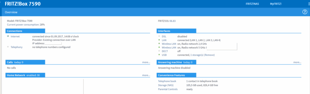 I have recently converted to Virgin Fibre since they cabled my street, so my set-up is using the WAN connection. This router also has an ADSL/VDSL model built in so it can handle all BT based connections such as Fibre. When I did my review of the 7490 there were not many VDSL capable routers out there and the features of the 7490 made it the best option out there, nowadays there is quite a bit more competition with price points to suit all budgets.The 7590 also supports something called super vectoring broadband, which I have to admit with I am unfamiliar with but promises speeds of up to 300Mbps over DSL. From what I can tell this is not really applicable in the UK, and BT is only trialling technologies such as G.fast at the moment. However, this will help future proof your router.Set up is quite straight forward, I plugged everything in then connected my laptop via cable to the router, the router did have the unusual IP of 192.168.178.1 but I am not sure if that was because I had another device on my normal network picking the .1.1 address.Once logged into the FRITZ!Box everything is very similar to my old 7490, the 2 routers are, for the most part, very similar. There is an extensive amount of options for you to tweak and it can be a little daunting, it certainly makes the F-Secure SENSE look basic. Some settings are also hidden away in an advanced mode which is enabled at the bottom left of the navigation bar, so I generally kept this on as it allowed access to some settings I wanted such as DNS.In the overview page, you can see your internet connection, which interfaces are enabled, phone calls, and answerphone messages. You can also see all the network connections.