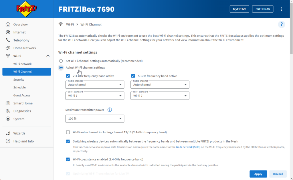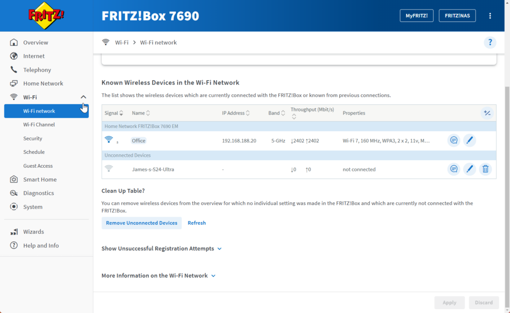 With Multi-Link Operation (MLO), which was introduced with WiFi 7, the client and router will allow compatible clients to maintain simultaneous connections on multiple frequency bands. The FRITZ!Box 7690 supports this in Enhanced Multi-Link Single Radio (EMLSR) mode, which can help reduce latency and improve connection stability. However, at the time of writing it is hard to tell if a device uses MLO. Both my Pixel and Samsung report that it connects to only 5GHz.