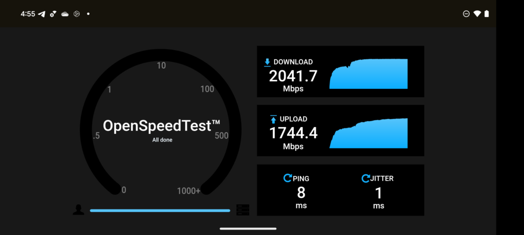 With these, I was able to achieve a peak throughput of 2041 Mbits/sec in the same room. In comparison, with the AVM FRITZ!Box 7590 AX I was only able to achieve 865 Mbits/sec.