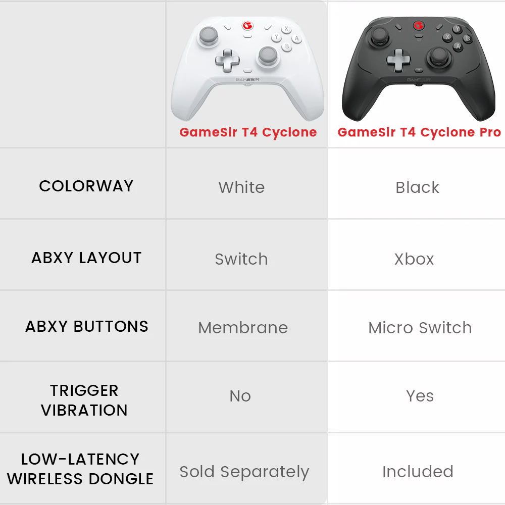 While the GameSir T4 Cyclone and T4 Cyclone Pro share several features, there are key differences. The Pro version follows the Xbox layout for face buttons, while the standard T4 Cyclone adheres to the Nintendo Switch layout.