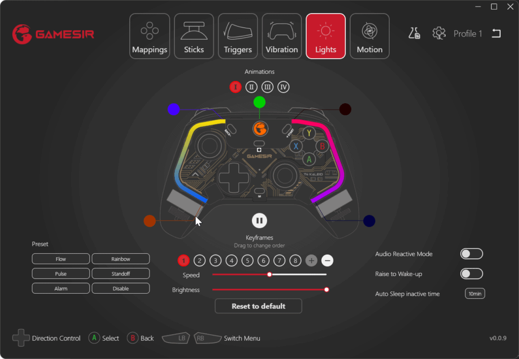 - 4 ultra-personalised light effects, perfectly tune the keyframe, speed, and brightness and the 5 light beads’ Change to suit your mood and style anytime. Meanwhile, the lights can also be programmed to be audio reactive via the GameSir T4k App software. This enables the T4k lighting to dance with the beats of the audio that is being played.