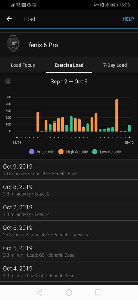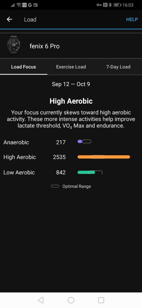 It also breaks down your training into a load focus of anaerobic, high aerobic and low, giving you a target load for each activity. I usually fall short of the anaerobic chart slightly so it is something I will try and improve once I finish the last of my races. I do a lot of aerobic work, and I feel best when my heart rate is above 140bpm, so my high aerobic is off the scale.