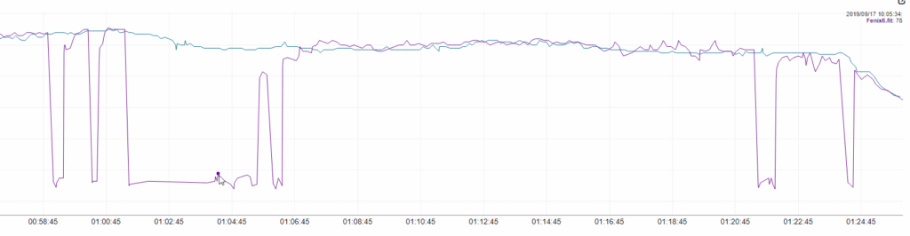 The recorded distance was 36.50 mi/ 58.74 k on the Edge 520 and 36.55 mi/ 58.81 k on the Fenix 6 Pro. Which is a 0.12% difference. That’s close enough for my liking.