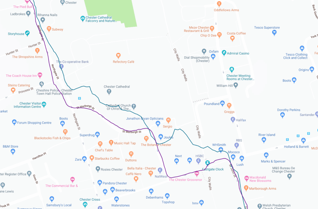 During the run through the town centre, the Fenix 5S has some serious accuracy issues, indicating I ran through a church and several shops.