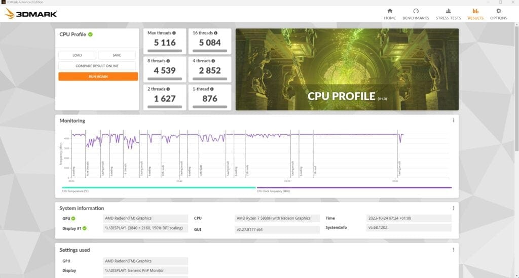 The 3DMark CPU profile results were a surprise, with A5 dominating most of the scores until it hit the 2 and 1 thread result. The single-thread result being lower than the Mini IT11 is something worth considering if you are looking at buying a mini-PC. I’d still favour the A5 over the IT11, though.