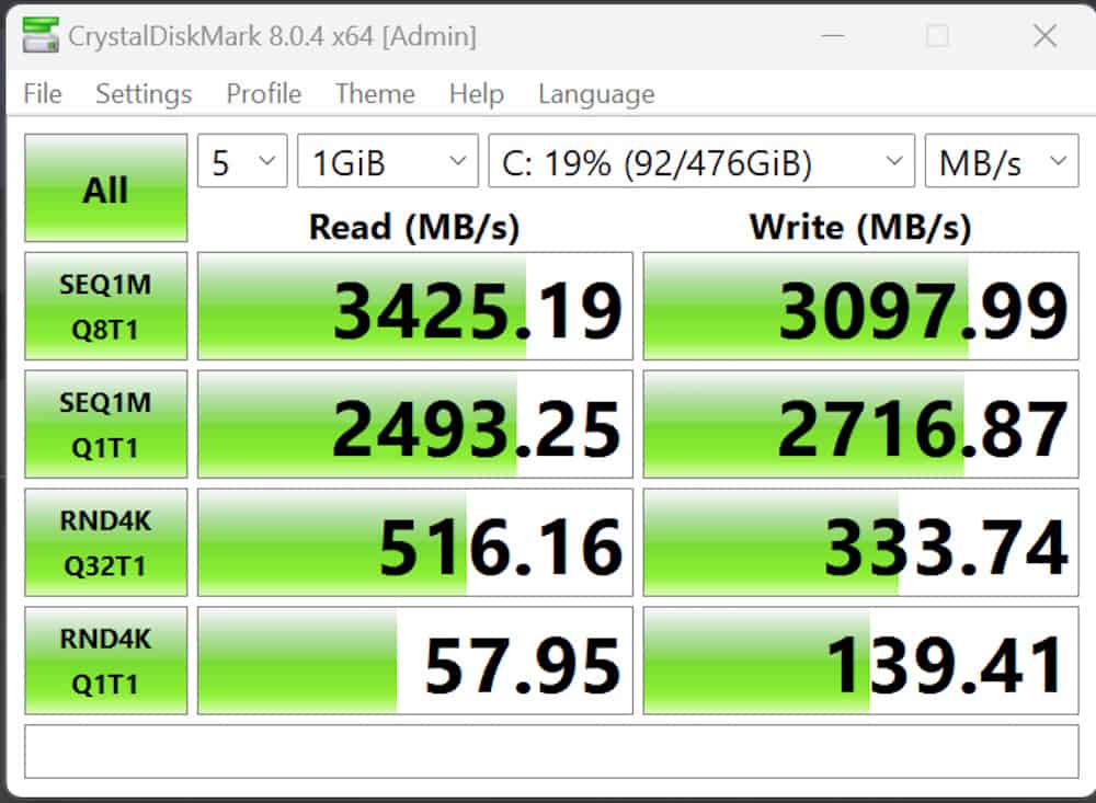 - Geekom A5: 3425MB/s Read – 3097MB/s Write
