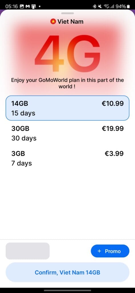 For Vietnam, I had some mixed results with the performance of the GoMoWorld eSIM; however, this seems to be the Vietnam network in general. I had different eSIMs installed on 3 other phones and had intermittent issues with all of them.