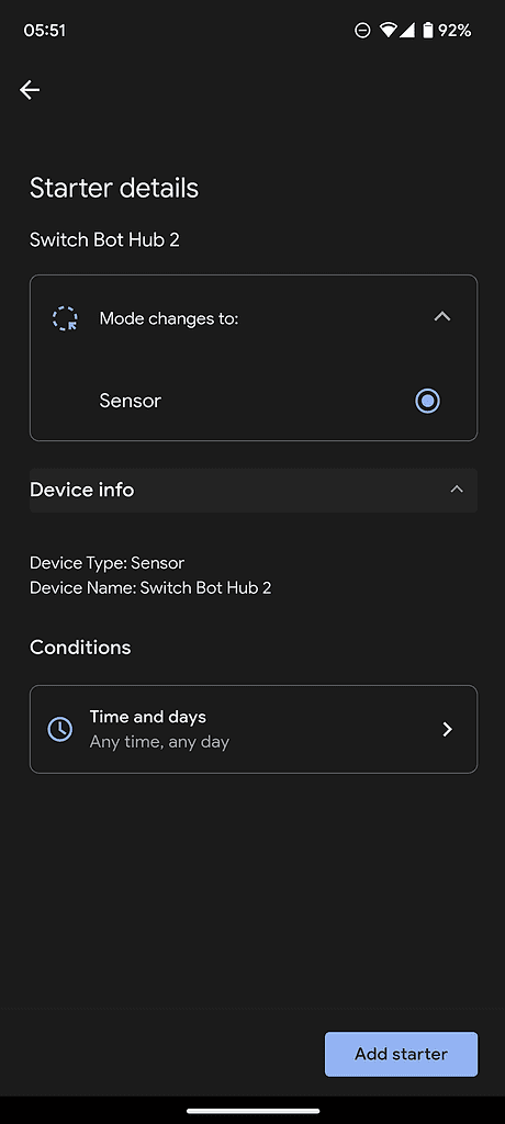 For the SwitchBot Hub, I don’t really have any options that make sense. I just have the option to select mode changes to the sensor.