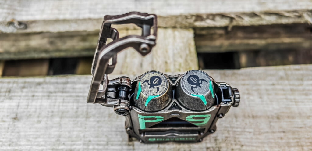 The charging case is zinc alloy in a distressed (war-damaged) grey and has a considerable amount of weight to it. It has 6 RGB lights to appease the gamer crowd, and you can even use it as a bottle opener. You then open the case with the little push button on the side.