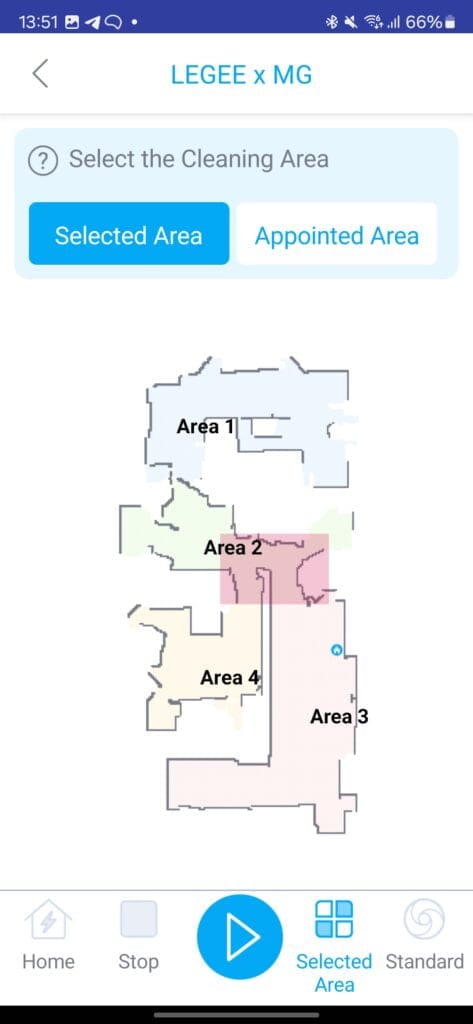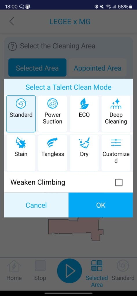 The Legee App offers a wide range of settings and features to customise your cleaning experience. From the main screen, you can start, pause, or stop a cleaning session, as well as view the robot’s current status and battery level.