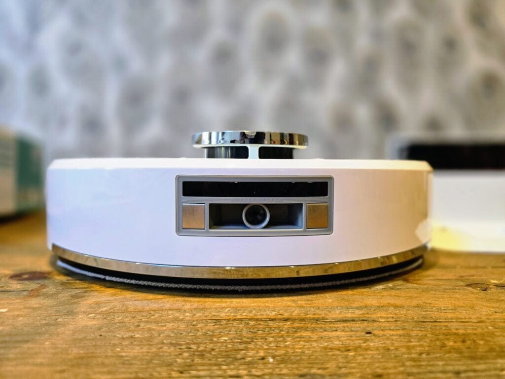 The robot has a high-quality build with durable materials. The top of the unit houses the LiDAR sensor for navigation, as well as the dustbin and water tank access. The front bumper contains the FDS (Fixed Distance Sensor) array for obstacle detection.