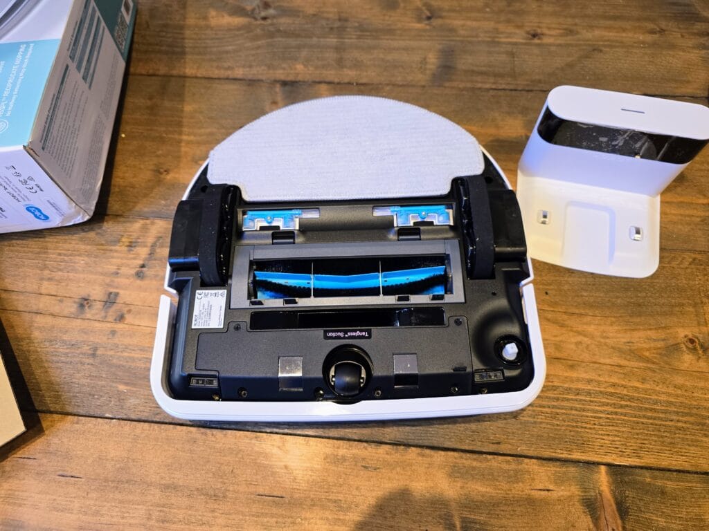 On the underside of the Legee D8, you’ll find the main brush roll, side brush, driving wheels, and mopping module. The mopping module can be easily attached or detached as needed.