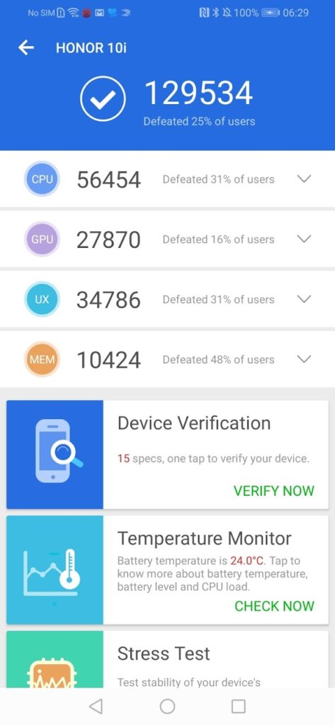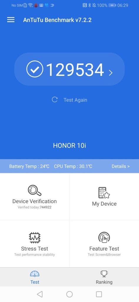 In Antutu the phone score 129534, which is more or less the same as all the other Kirin 710 phones I have used. In the real world, the phone performs well for all day to day tasks, navigation is smooth, apps quick to launch and the phone can handle any premium games you through at it.