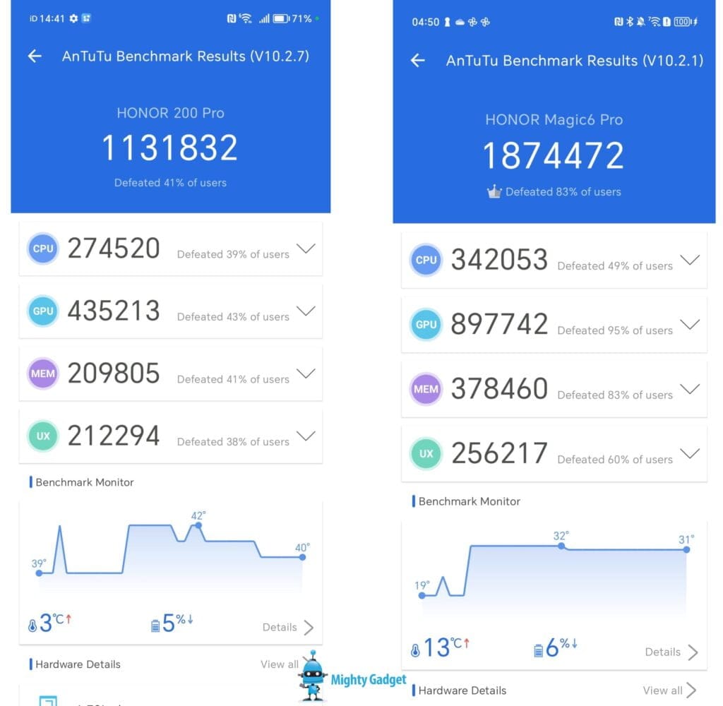 - Honor Magic6 Pro: 18160 high, 11867 low, 65.4% stability, 672mAh/12%pts