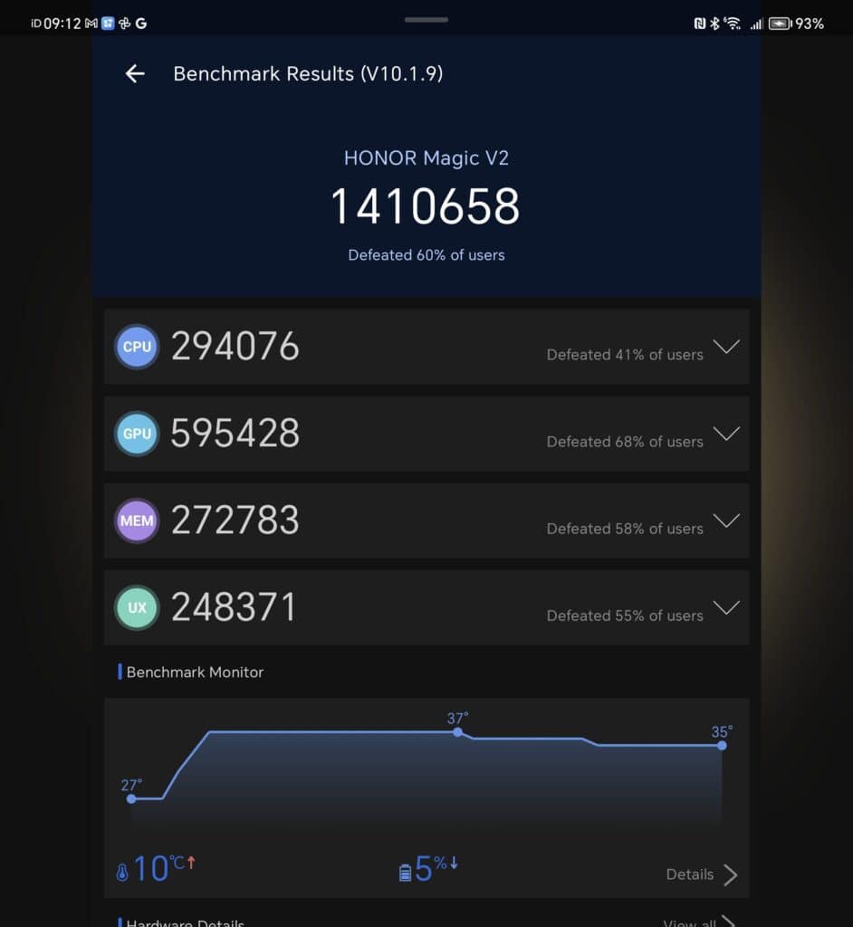 Beyond synthetic benchmarks, the Magic V2, just like all other Snapdragon 8 Gen 2-equipped phones, runs everything with ease. No software lags, there is no shutter lag, the UI is ultra responsive thanks to the 120Hz display rate, and it runs games incredibly well while not getting too hot.