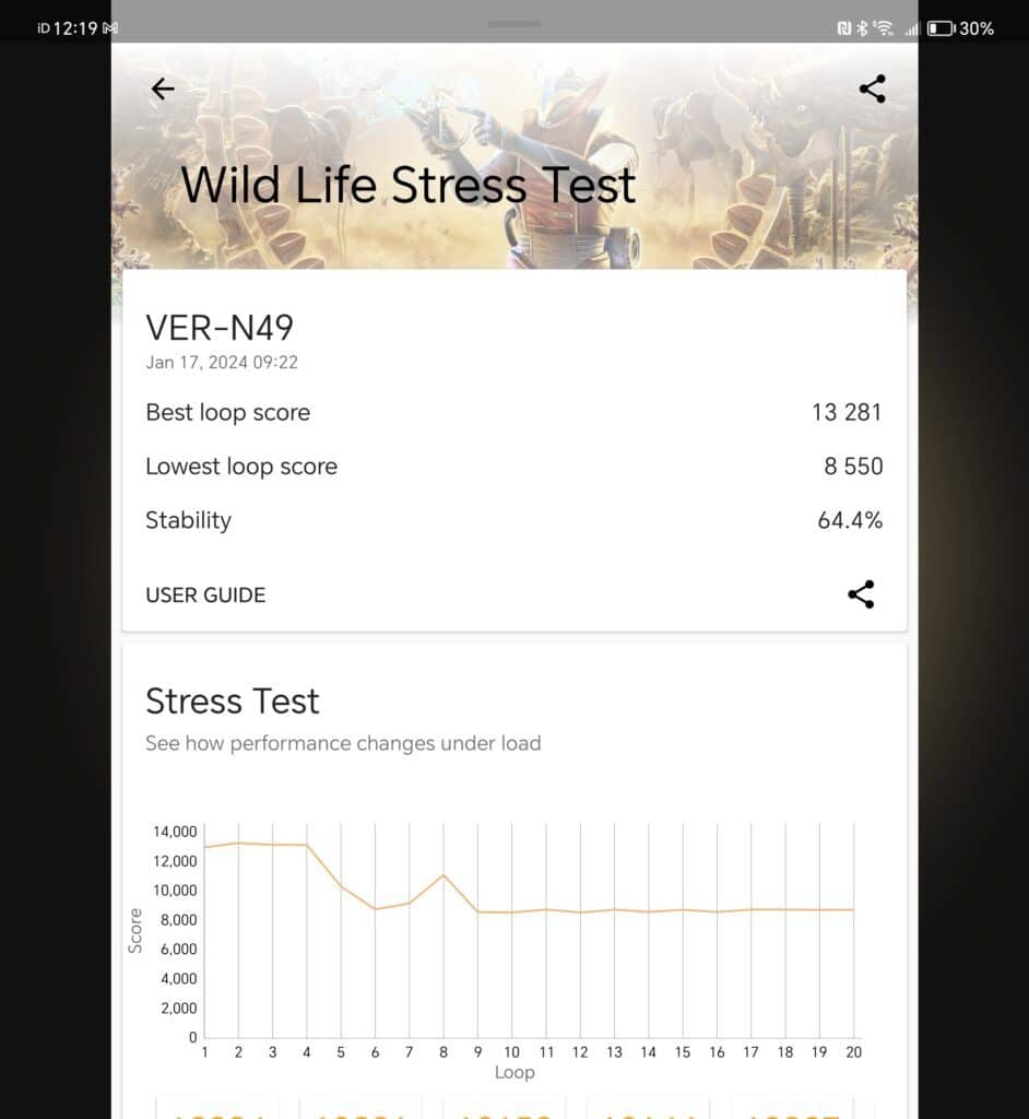 For the 3DMark Wildlife Stress Test, the Magic V2 scored a slightly higher score of 13281 and an almost identical lowest score of 8550, giving it a slightly lower stability of 64.4%. What is interesting is that the battery only dropped from 100% down to 95%. The Magic5 Pro has a bigger batter and dropped from 100% to 92%.