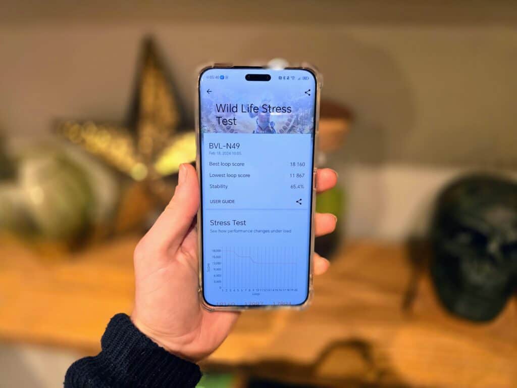 In the 3Dmark Wild Life Stress Test, the Honor is fractionally behind the IQOO 12 for the high score, low score and stability, but the battery depletes slightly less. It then performs better than the S24 Ultra for all aspects of the test. The Pixel 8 Pro with the Google Tensor G3 doesn’t even come close.