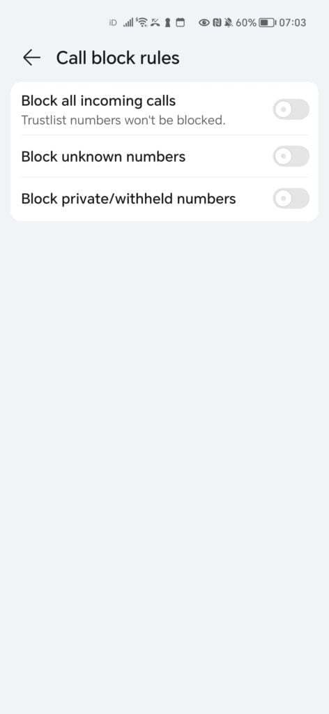 If you don’t want to receive calls from withheld numbers or unknown numbers, you can block them all via the settings menu as well. Again, for Android, this will vary between brands. For my Honor:
