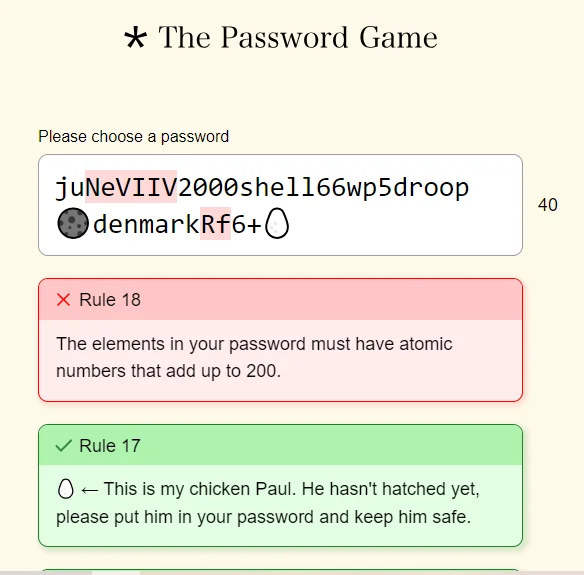 - Making the atomic numbers of elements in your password add up to 200 (Rule 18)