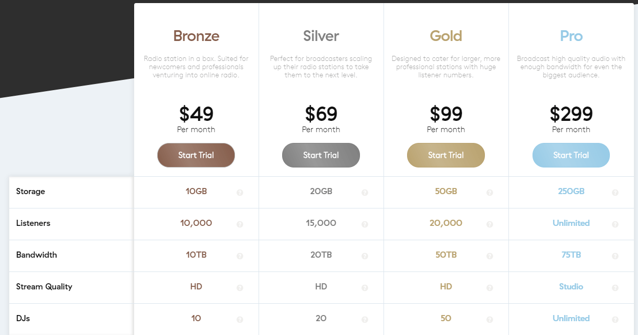 Radio.co offer packages ranging from $49 per month to $299 per month – which includes all the technology & tools you need to get started.