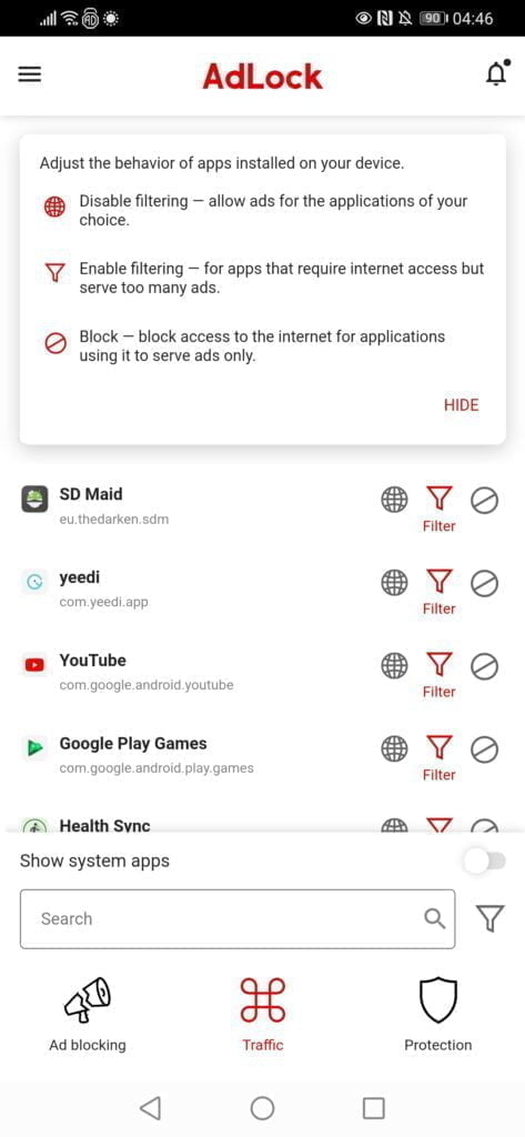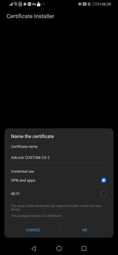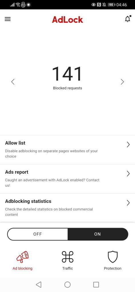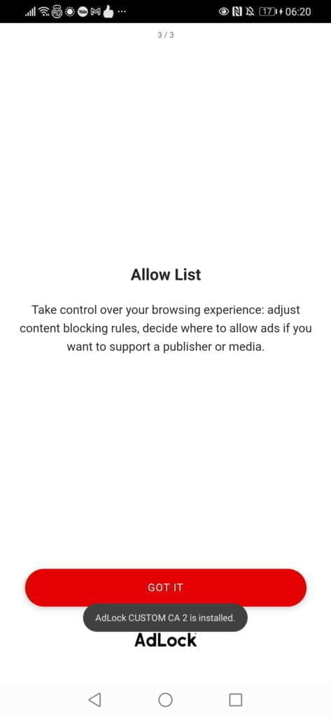 For Android phones, after installing AdLock you will need to enable HTTPS filtering, which will install a CA certificate on your phone that is required for the adblocking.