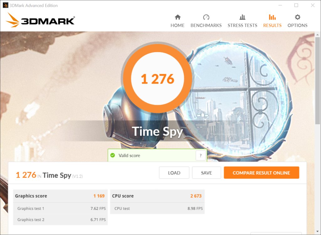 - 3DMark Time Spy: 1276 (CPU: 2673 GPU: 1169)