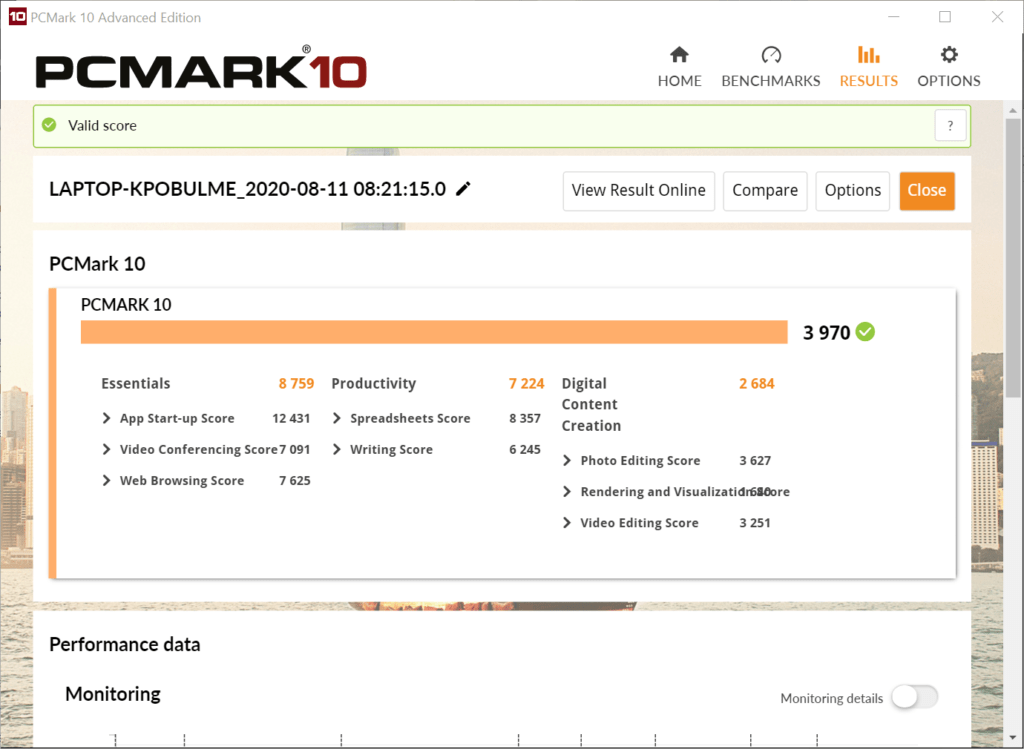 - PCMark: 3970 (Essentials: 8759 Productivity: 7224 Digitial: 2684)