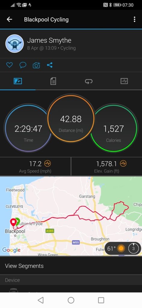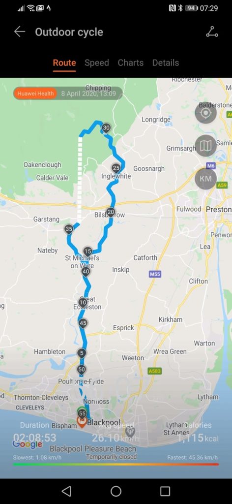 On a bike ride, I had a bit of an issue, I have either forgotten to unpause the ride, or it lost GPS. So the section between 30km and 35km has been worked out as the crow flies, which then knocked 12km of my total distance. It was probably my fault, but with limited outdoors time it is hard to confirm at the moment.