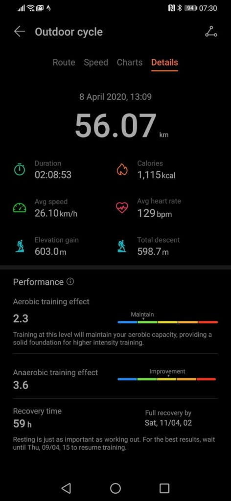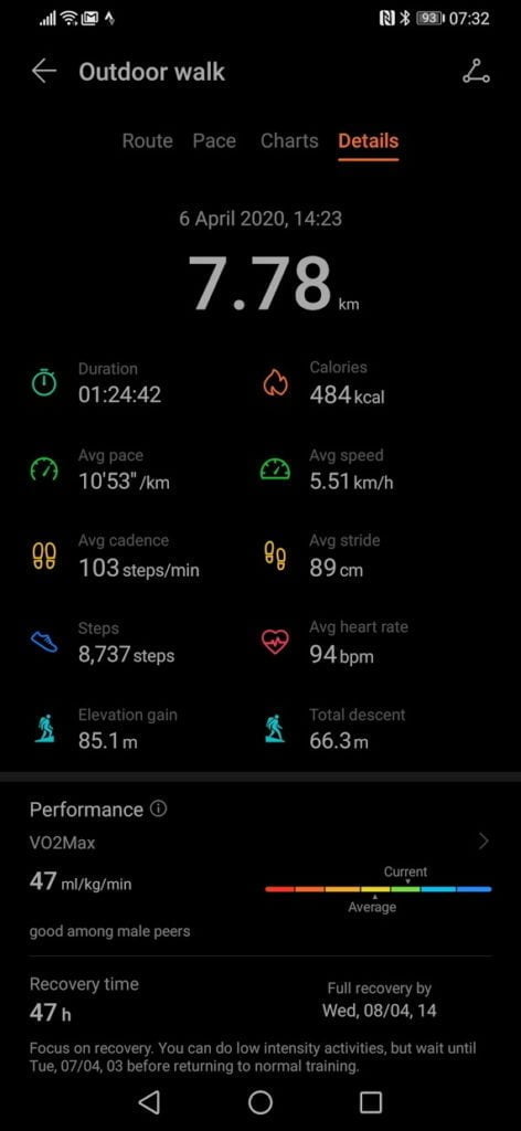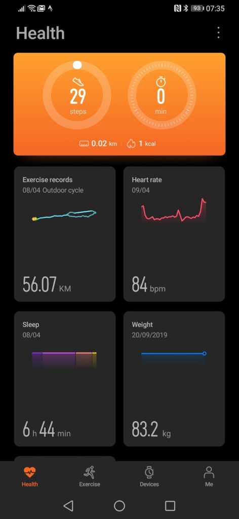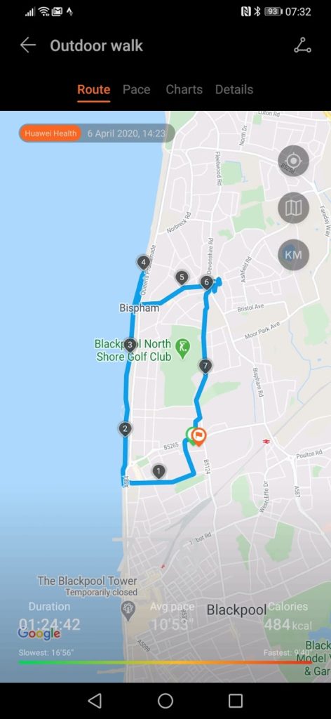 On my walk to the shops the GT2e tracked 7.78km/4.83miles and Garmin recorded 4.69 miles/7.54km. I can’t be sure which one is the accurate one here, I would guess Garmin, for most scenarios, this is not a problem, but if you in an event it can mean the difference between an app like Strava identifying a 5K/10k distance or not (if you could export). In this case, the Huawei has a longer distance, so the worst-case scenario is your pace is fractionally off.