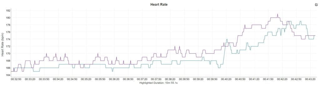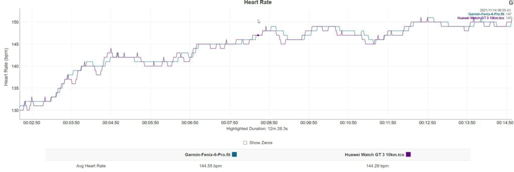Similarly, on a 10km run, tracking remained accurate in the early part of my run, but as my pace and heart rate picked up the heart rate readings started to separate from each other. From about 30 mins the Huawei started to record consistently 33bp higher and at 40mins this started to increase to 6bmp.
